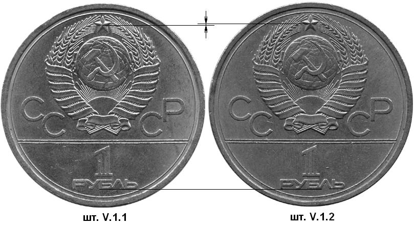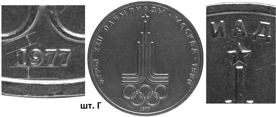 Шт. Г. Зазор между цифрой "1" в дате "1977" и кантом примерно такой же по величине, как и зазор между этой цифрой и нижним кольцом в эмблеме. Звезда в эмблеме малая, выпуклая, правильной формы, удалена от стилизованного изображения шпиля башни. Расстояние от даты и от всех остальных букв в легенде до канта чуть меньше, чем у шт.В.