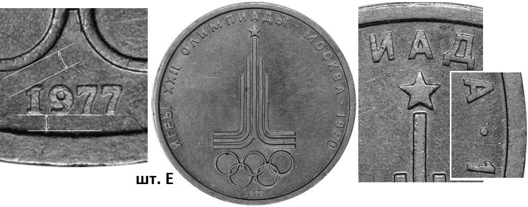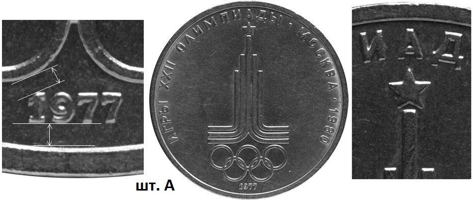 Шт. А. Зазор между цифрой "1" в дате "1977" и кантом заметно больше, чем зазор между этой цифрой и нижним кольцом в эмблеме. Звезда в эмблеме крупная, уплощенная, слегка неправильной формы (правый и левый лучи у основания шире трех остальных, в результате чего нижние лучи выглядят слегка укороченными). Звезда приближена к стилизованному изображению шпиля башни. Расстояние от букв в легенде до канта среднее (больше, чем у шт.Б, но меньше, чем у шт.В и шт.Г).