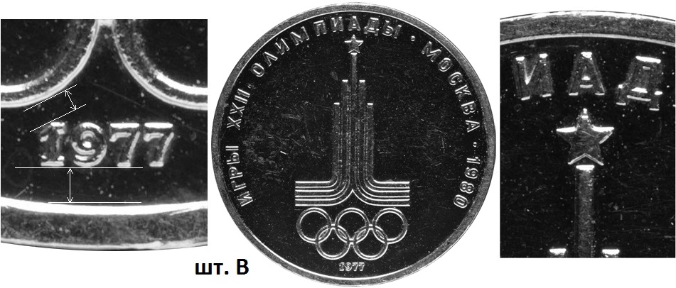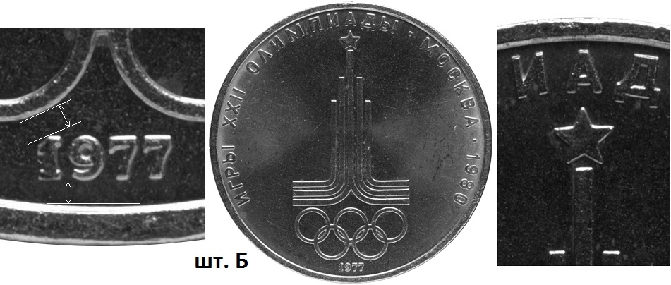 Шт. Б. Зазор между цифрой "1" в дате "1977" и кантом примерно такой же по величине, как и зазор между этой цифрой и нижним кольцом в эмблеме. Звезда в эмблеме крупная, плоская, слегка неправильной формы (правый и левый лучи у основания шире трех остальных, в результате чего нижние лучи выглядят слегка укороченными). Звезда удалена от стилизованного изображения шпиля башни. Расстояние от букв в легенде до канта наименьшее. В целом рельеф всех элементов изображения низкий и уплощенный.