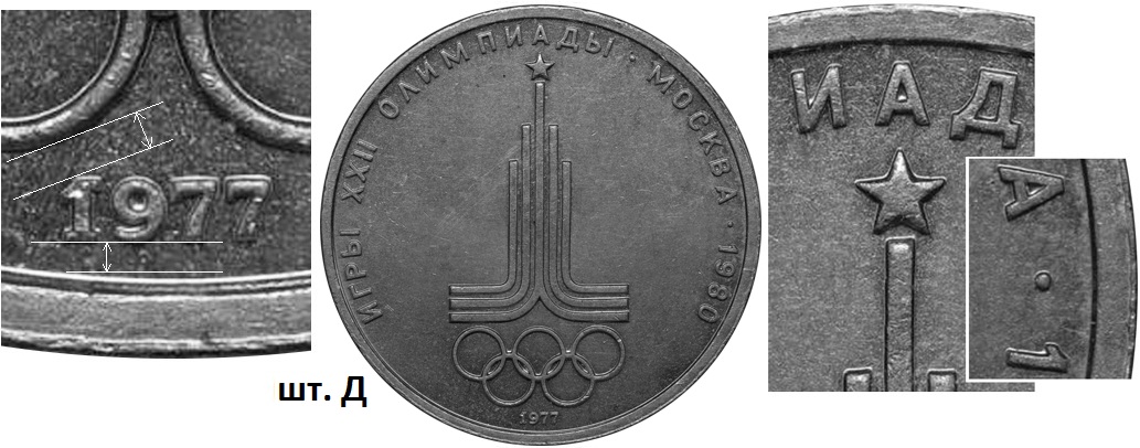 Шт. Д. Зазор между цифрой "1" в дате "1977" и кантом заметно меньше, чем зазор между этой цифрой и нижним кольцом в эмблеме. Звезда в эмблеме малая, выпуклая, правильной формы. Расстояние от даты до канта наименьшее, а расстояние от всех букв в легенде до канта чуть больше, чем у шт.Б.