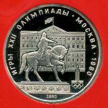 В середине поля памятник Юрию Долгорукому. На втором плане - здание Моссовета. В нижнем сегменте под памятником - дата чеканки монеты "1980". Справа внизу эмблема Олимпиады-80. С внутренней стороны вдоль внешнего ободка монеты расположена надпись: "ИГРЫ XXII ОЛИМПИАДЫ. МОСКВА. 1980".