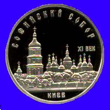В центре панорама Софийского собора в Киеве и деревья. Под ними надпись "КИЕВ". Справа - "XI ВЕК". Вверху вдоль внешнего ободка монеты полукругом надпись "СОФИЙСКИЙ СОБОР".