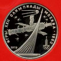 В середине поля на фоне звезд пилотируемый орбитальный космический комплекс "Союз-Салют" в совместном полете, над ним - первый искусственный спутник Земли. Снизу вверх, перечеркивая поле по диагонали, расположен обелиск "Покорителям космоса". Слева от него внизу - дата чеканки монеты "1979". Справа внизу эмблема Олимпиады-80. С внутренней стороны вдоль внешнего ободка монеты расположена надпись: "ИГРЫ XXII ОЛИМПИАДЫ. МОСКВА. 1980".