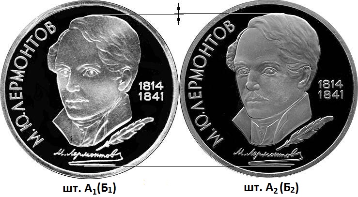 2. Известны монеты качества ПРУФ c реверсами А и Б, отчеканенные на Ленинградском монетном дворе, незначительно отличающиеся размерами изображения: реверсы А1 и Б1 с уменьшенными размерами изображения, а реверсы А2 и Б2 – с увеличенными. Реверсы А и Б на монетах Московского монетного двора по размерам изображения аналогичны ленинградским монетам с увеличенными размерами изображения (шт. А2 и Б2, соответственно).