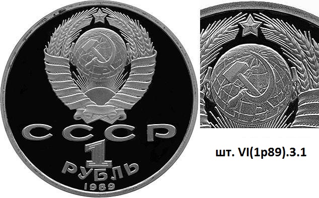 Шт. VI(1р89).3.1. Штемпель, аналогичный шт. VI(1р87).3.1 и шт.VI(1р88).3.1, но с датой "1989": параллели и меридианы над поверхностями океанов на земном шаре в гербе выпуклые. Гребенка верхних остей справа от звезды имеет уступ. Цифры даты приближены к канту монеты.