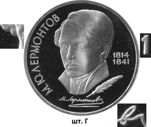 В центре портрет М.Ю.Лермонтова. Справа от него годы жизни "1814" и "1841", написанные друг под другом. Под портретом изображение гусиного пера и факсимильная подпись поэта. Слева вдоль канта монеты снизу вверх надпись "М.Ю.ЛЕРМОНТОВ".