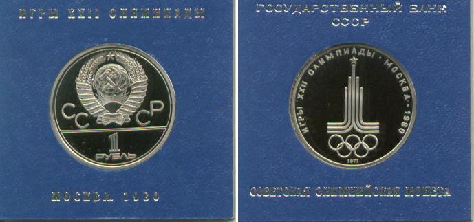 В середине поля эмблема Московской Олимпиады, под ней дата выпуска монеты "1977". С внутренней стороны вдоль внешнего ободка монеты расположена надпись: "ИГРЫ XXII ОЛИМПИАДЫ. МОСКВА. 1980".