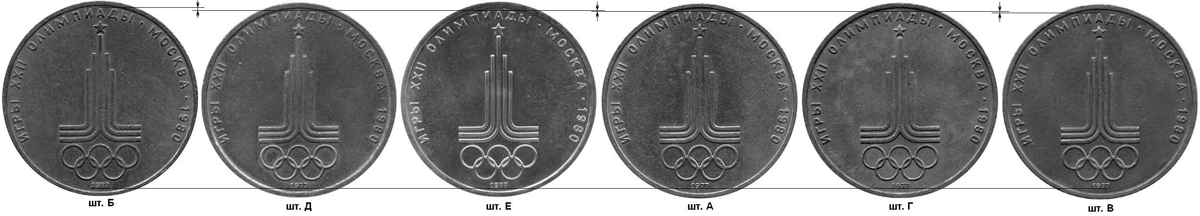 Шт. А. Зазор между цифрой "1" в дате "1977" и кантом заметно больше, чем зазор между этой цифрой и нижним кольцом в эмблеме. Звезда в эмблеме крупная, уплощенная, слегка неправильной формы (правый и левый лучи у основания шире трех остальных, в результате чего нижние лучи выглядят слегка укороченными). Звезда приближена к стилизованному изображению шпиля башни. Расстояние от букв в легенде до канта среднее (больше, чем у шт.Б, но меньше, чем у шт.В и шт.Г).