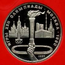 В середине поля на заднем плане силуэты Кремля, высотных зданий Москвы, здания СЭВ и Останкинской телебашни. Внизу круг стадиона, от которого вверх поднимается рука, сжимающая олимпийский факел. Справа внизу - дата чеканки монеты "1980". Слева от факела эмблема Олимпиады-80. С внутренней стороны вдоль внешнего ободка монеты расположена надпись: "ИГРЫ XXII ОЛИМПИАДЫ. МОСКВА. 1980".