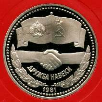 В верхней части изображение государственных флагов: справа - СССР, слева - НРБ. В центре изображение рукопожатия, символизирующего дружбу советского и болгарского народов, под ним полукругом надпись "ДРУЖБА НАВЕКИ". Внизу две лавровые ветви и дата "1981", обозначающая год чеканки. По окружности вдоль внешнего ободка монеты расположен орнамент из точек.