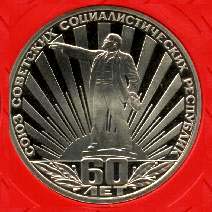 В центре на фоне лучей солнца рельефное изображение В.И.Ленина. Под ним на фоне лавровых ветвей надпись "60 ЛЕТ". От левой до правой лавровой ветви вдоль внешнего ободка монеты по окружности расположена надпись "СОЮЗ СОВЕТСКИХ СОЦИАЛИСТИЧЕСКИХ РЕСПУБЛИК".