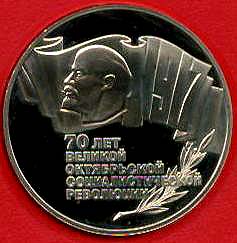 В центре группа революционных гвардейцев - крестьянин, рабочий и солдат.Над ними дата "1917". Вдоль внешнего ободка монеты полукругом расположена надпись "СЕМЬДЕСЯТ ЛЕТ ВЕЛИКОЙ ОКТЯБРЬСКОЙ СОЦИАЛИСТИЧЕСКОЙ РЕВОЛЮЦИИ".