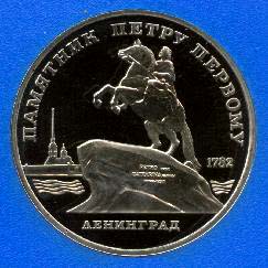 В центре памятник Петру Первому в Ленинграде на фоне силуэта Петропавловской крепости. Под ним надпись "ЛЕНИНГРАД". Справа от памятника дата "1782". Вверху вдоль внешнего ободка монеты полукругом надпись "ПАМЯТНИК ПЕТРУ ПЕРВОМУ".
