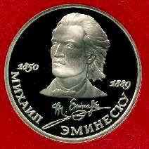 В центре портрет М.Эминеску. Слева от него год рождения "1850", справа - год смерти "1889". Под портретом факсимильная подпись, а еще ниже вдоль внешнего ободка монеты полукругом надпись "МИХАИЛ ЭМИНЕСКУ"