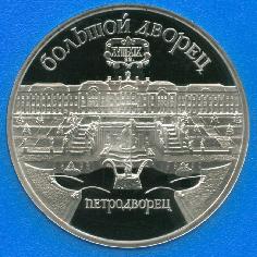 В центре изображение панорамы Большого дворца с каскадом фонтанов. Под ней надпись "ПЕТРОДВОРЕЦ". В верхней части вдоль внешнего ободка монеты полукругом надпись "БОЛЬШОЙ ДВОРЕЦ", под ней дата в две строки- "XVIII-XIX в.в.", обрамленная старинным узором.