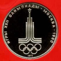 В середине поля эмблема Московской Олимпиады, под ней дата выпуска монеты "1977". С внутренней стороны вдоль внешнего ободка монеты расположена надпись: "ИГРЫ XXII ОЛИМПИАДЫ. МОСКВА. 1980".