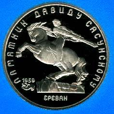 В центре изображение памятника Давиду Сасунскому. Под ним надпись "ЕРЕВАН". Слева от постамента дата "1959", а под ней декоративная виньетка. Вверху вдоль внешнего ободка монеты полукругом надпись "ПАМЯТНИК ДАВИДУ САСУНСКОМУ".