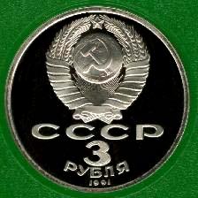 3 рубля. Медно-никелевый сплав белого цвета. Диаметр 33 мм. Толщина по краю 2,3 мм. Масса – 14,35 г. Тираж: всего – 2,5 млн. экз., в том числе 350,0 тыс. шт. улучшенного качества.
