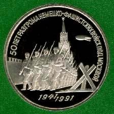 В центре изображение колонны советских солдат на фоне Кремлевской стены и Спасской башни. Справа изображения: вверху - привязного аэростата, внизу - заграждения из рельс типа "еж". Внизу ступенькой даты "1941" и "1991". В верхней части вдоль внешнего ободка монеты по окружности расположена надпись "50 ЛЕТ РАЗГРОМА НЕМЕЦКО-ФАШИСТКИХ ВОЙСК ПОД МОСКВОЙ".