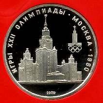 В середине фасад главного здания МГУ имени М.В.Ломоносова на Ленинских (теперь Воробьевых) горах, под ним - дата чеканки монеты "1979". Справа вверху эмблема Олимпиады-80. С внутренней стороны вдоль внешнего ободка монеты расположена надпись: "ИГРЫ XXII ОЛИМПИАДЫ. МОСКВА. 1980".